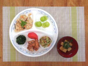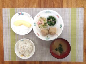 ≪給食≫ ・テーブルパン ・わかめスープ ・かじきのオニオンソースがけ ・付け合わせ(トマト・ブロッコリー) ・じゃがいものチーズ焼き(アレルギー対応はじゃがいも青海苔焼き) ・フルーツ(みかん)