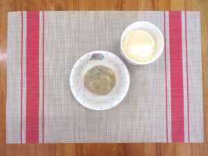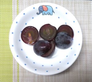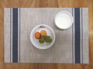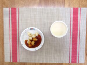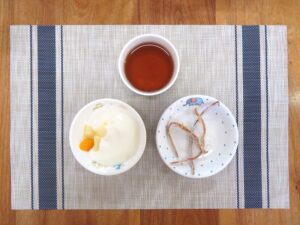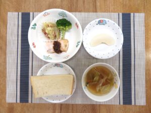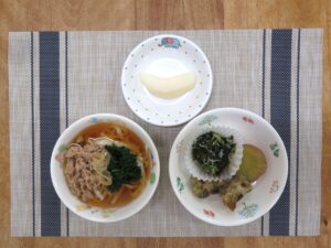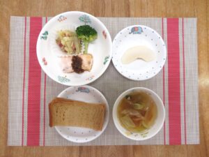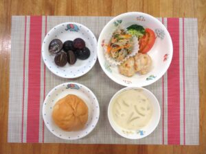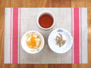 ≪おやつ≫ ・番茶 ・フルーツヨーグルトあえ(豆乳寒天入りフルーツポンチ) ・するめ(0∼2歳児は食べる煮干し)