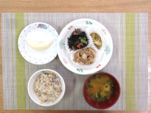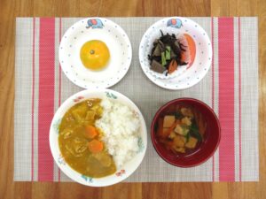 ≪給食≫ ・ポークカレー(アレルギー対応はバター抜きポークカレー) ・豆腐スープ ・くし切りトマト ・ひじきの煮物 ・フルーツ(みかん)
