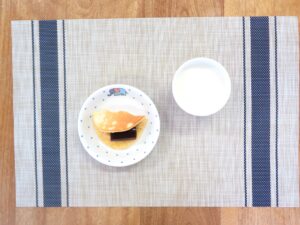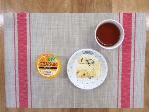 ≪おやつ≫ ・牛乳(アレルギー対応は豆乳) ・えいようかん入りオムレット(アレルギー対応はえいようかん入り豆乳オムレット)