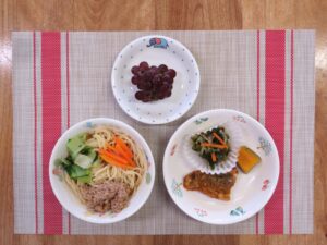 ≪給食≫ ・ジャージャー麵(アレルギー対応はあわ麺) ・ちくわの磯辺揚げ ・かぼちゃのグラッセ(アレルギー対応はかぼちゃの煮物) ・わかめと糸寒天のサラダ ・フルーツ(ぶどう)