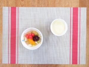 ≪おやつ≫ ・牛乳(アレルギー対応は豆乳) ・クリームあんみつ(乳児用・アレルギー対応は豆乳寒天入りあんみつ)