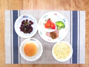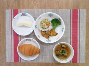 ≪給食≫ ・ロールパン(アレルギー対応はテーブルパン) ・コーンスープ(アレルギー対応は豆乳コーンスープ) ・豚ひれ肉のごまソースかけ ・温野菜(ブロッコリー) ・トマトとわかめのあえ物 ・フルーツ(ぶどう)