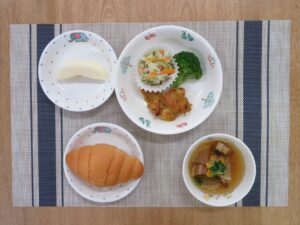 ≪給食≫ ・テーブルパン ・大根スープ ・鶏肉のカレー風味焼き(アレルギー対応はヨーグルト抜き鶏肉のカレー風味焼き) ・温野菜(ブロッコリー) ・コールスローサラダ ・フルーツ(りんご)