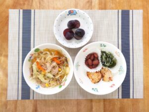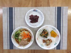 ≪給食≫ ・野菜うどん ・かじきのつくね焼 ・煮豆 ・じゃこ入り酢の物 ・フルーツ(ぶどう)