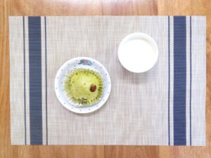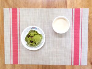 ≪おやつ≫ ・牛乳(アレルギー対応は豆乳) ・抹茶豆乳蒸しパン(アレルギー対応は卵なし抹茶豆乳蒸しパン)