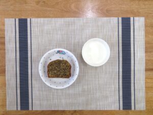 ≪おやつ≫ ・牛乳(アレルギー対応は豆乳) ・紅茶のパウンドケーキ(アレルギー対応は豆乳入り紅茶のパウンドケーキ)