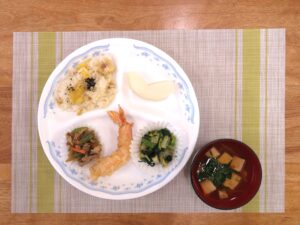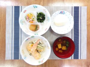 今日は「お誕生日会」メニューです。「うな丼」と夏野菜の枝豆、かぼちゃを使った彩りあるメニューです。うなぎには疲労回復や食欲増進に効果的な栄養素が含まれています。