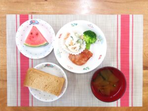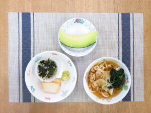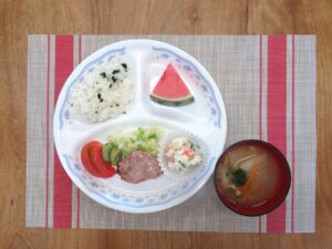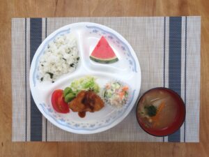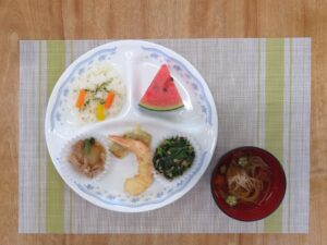 ≪給食≫ ・七夕ご飯 ・天の川スープ ・天ぷら(海老・かぼちゃ) ・モロヘイヤの納豆あえ ・とうがんと豚肉の炒り煮 ・フルーツ(すいか)