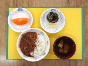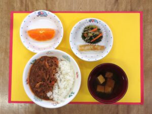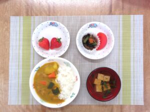 ≪給食≫ ・チキンカレー ・豆腐スープ ・くし切りトマト ・ひじきの煮物 ・フルーツ(いちご)