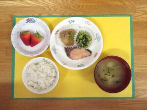 ≪給食≫ ・麦ご飯 ・味噌汁 ・ぶりの照り焼き ・磯部あえ ・豚肉と大根の煮物 ・フルーツ(いちご)