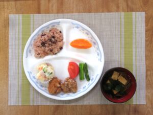 ≪給食≫ ・お赤飯 ・すまし汁 ・鶏のから揚げ ・付け合わせ(くし切りトマト・グリーンアスパラ) ・ポテトサラダ ・フルーツ(国産柑橘せとか)