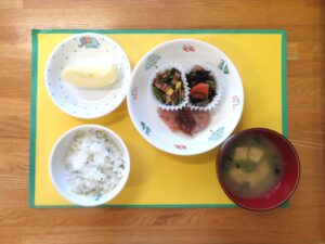 今日の給食は和食メニューです。「たらの磯辺揚げ」は、青のりの香りが引き立ちご飯が進みます。また、味がよく染み込みふっくらと煮えた「切り干し大根の煮物」も子どもたちに人気があります。
