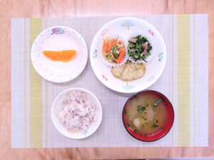 ≪給食≫ ・ゆかりご飯 ・味噌汁 ・たらの磯辺揚げ ・ほうれん草のおひたし ・切り干し大根の煮物 ・フルーツ(国産柑橘)