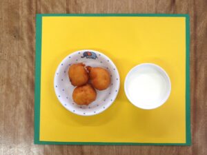 本日の「ぶりの照り焼き」「豆腐ドーナッツ」はすみれ組のリクエストメニューです。