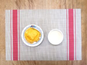 ≪おやつ≫ ・牛乳(アレルギー対応は豆乳) ・蒸しパン(アレルギー対応は卵抜き蒸しパン)