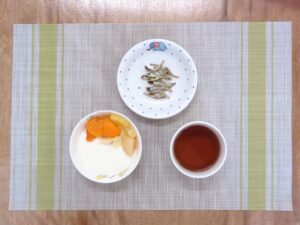 ≪おやつ≫ ・番茶 ・フルーツヨーグルトあえ ・食べる煮干し