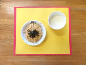 ≪おやつ≫ ・牛乳(アレルギー対応は豆乳) ・たらこスパゲッティ