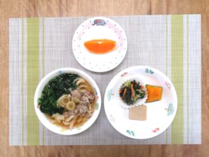 ≪給食≫ ・甘辛肉うどん ・高野豆腐の煮物 ・かぼちゃのはちみつ煮 ・わかめと糸寒天のサラダ ・フルーツ(国産柑橘)