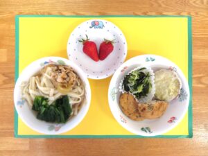 ≪給食≫ ・きつねうどん ・がんもどきの煮物 ・さつまいもの天ぷら ・じゃこ入り酢の物 ・フルーツ(いちご)
