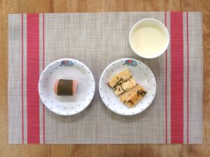 ≪おやつ≫ ・牛乳(アレルギー対応は豆乳) ・桜餅 ・辻安全食品のミニソフト煎餅