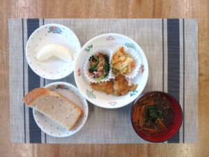 本日はパンメニューです。甘いきな粉クリームが子どもたちに人気でよく食べていました。