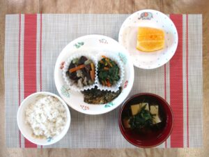 本日は、「和食メニュー」です。なすが苦手な子は多いですが、みそ汁に入れると残すことは少ないです。