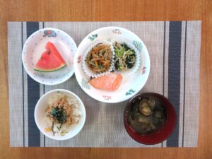 ≪給食≫ ・鶏そぼろご飯 ・味噌汁 ・鮭の塩焼き ・ごまあえ(アレルギー対応は磯辺あえ) ・切り干し大根の煮物 ・フルーツ(すいか)