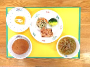 2023年2月9日 by 和光保育園 2月9日(木)給食 2月9日(木)おやつ 2月9日(木)アレルギー対応おやつ ≪給食≫ ・テーブルパン ・レタススープ ・鶏の梅照り焼き ・温野菜(ブロッコリー) ・春雨の中華サラダ ・フルーツ(伊予柑) ≪おやつ≫ ・牛乳(アレルギー対応は豆乳) ・ツナピラフ 「レタススープ」は、レタスをたっぷり使い、人参・ロースハム・出汁の旨味でいただきます。シンプルな材料ですが子どもたちから人気のあるメニューです。