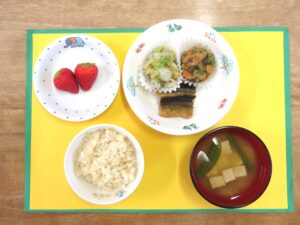 2023年2月24日 by 和光保育園 2月24日(金)給食 2月24日(金)おやつ 2月24日(金)アレルギー対応おやつ ≪給食≫ ・胚芽ご飯 ・味噌汁 ・さんまのかば焼き ・白菜のゆかりあえ ・おからの五目煮 ・フルーツ(いちご) ≪おやつ≫ ・牛乳(アレルギー対応は豆乳) ・ひじき入り肉まん おやつの「ひじき入り肉まん」は、生地から給食室で作り、一つひとつ丁寧に包んでいます。栄養のあるひじきを肉まんに入れています。肉汁があふれ、寒い時期にも人気のあるおやつです。