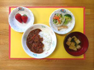 ≪給食≫ ・ハッシュドポーク ・豆腐スープ ・スティックチーズ(アレルギー対応は魚のソテー) ・コールスローサラダ ・フルーツ(いちご)