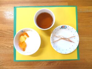 ≪おやつ≫ ・番茶 ・フルーツヨーグルトあえ ・するめ(つぼみ・はと組は食べる煮干し)