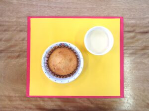 ≪おやつ≫ ・牛乳(アレルギー対応は豆乳) ・オレンジピール入りマドレーヌ(アレルギー対応は卵抜きマドレーヌ)
