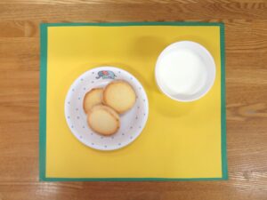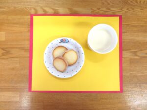 ≪おやつ≫ ・牛乳(アレルギー対応は豆乳) ・ココナツサブレ(アレルギー対応は卵抜きココナツサブレ)