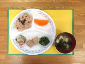 ≪給食≫ ・お赤飯 ・味噌汁 ・高野豆腐の肉詰め煮 ・菜の花のごまあえ ・酢の物 ・フルーツ(伊予柑)