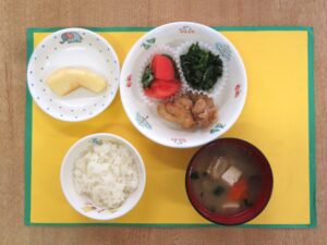 2023年3月15日 by 和光保育園 3月15日(水)給食 3月15日(水)おやつ 3月15日(水)アレルギー対応おやつ ≪給食≫ ・ご飯 ・けんちん味噌汁 ・鶏のから揚げ ・おかかあえ ・わかめとトマトのサラダ ・フルーツ(りんご) ≪おやつ≫ ・牛乳(アレルギー対応は豆乳) ・木の葉焼き(アレルギー対応は卵抜き) 「鶏のから揚げ」は、前日から調味料に漬け味を染み込ませました。子どもたちに人気あるメニューです。 本日の「鶏のから揚げ」「おかかあえ」「木の葉焼き」は、すみれ組のリクエストメニューです。
