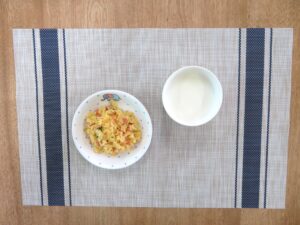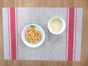 本日のおやつは「人参ライス」です。栄養価の高い胚芽精米に、すりおろした人参と鶏ガラを入れ炊き上げました。人参には、βカロテンが多く含まれていて肌荒れ防止や免疫力を高める効果があります。