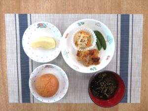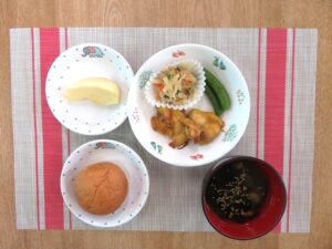 ≪給食≫ ・変わりパン ・わかめスープ ・鶏肉のカレー風味焼き(アレルギー対応はヨーグルトなし) ・スナップエンドウのソテー ・大根とじゃこのあえ物 ・フルーツ(りんご)