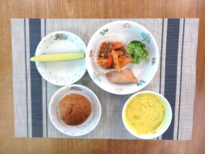 ≪給食≫ ・レーズンパン ・かぼちゃスープ(アレルギー対応は豆乳かぼちゃスープ) ・鶏の照り焼き ・温野菜(ブロッコリー) ・パスタのケチャップ炒め ・フルーツ(メロン)