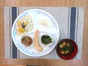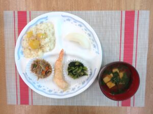 ≪給食≫ ・栗おこわ(アレルギー対応は黒ごま抜き) ・すまし汁 ・えびの天ぷら ・磯辺あえ ・変わりきんぴら ・フルーツ(梨)