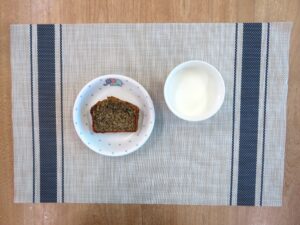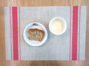 ≪おやつ≫ ・牛乳(アレルギー対応は豆乳) ・紅茶のパウンドケーキ(アレルギー対応は豆乳入り紅茶のパウンドケーキ)