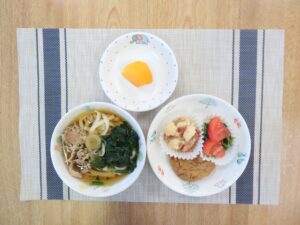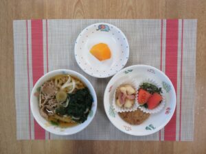 本日のメニューは、子どもたちに人気のある甘辛肉うどんでした。出汁の効いたスープと生姜の効いたお肉が体を温めます。