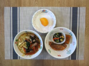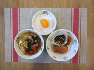 ≪給食≫ ・チャイニーズニューメン ・鮭のきな粉衣揚げ ・かぼちゃの煮物 ・ほうれん草のナムル(アレルギー対応は白ごま抜き) ・フルーツ(柿)
