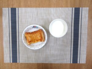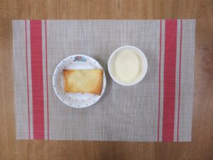 ≪おやつ≫ ・牛乳(アレルギー対応は豆乳) ・アップルパイ(アレルギー対応はアップルパイ風)