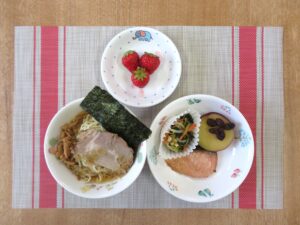 2025年3月12日 by 和光保育園 3月11日(火)給食 3月11日(火)おやつ 3月11日(火)アレルギー対応給食 3月11日(火)つぼみ組,はと組用おやつ ≪給食≫ ・海苔ラーメン ・鮭のソテー ・おいもの甘煮 ・ほうれん草のナムル(アレルギー対応は白ごま抜き) ・フルーツ(いちご) ≪おやつ≫ ・牛乳 ・二色サンド(つぼみ組,はと組は生クリーム抜き) 本日の給食・おやつは、「すみれ組さんのリクエストメニュ」です。 「海苔ラーメン」は、すみれ組さんをはじめ、どのクラスでも人気のメニューです。