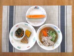 2025年7月16日 by 和光保育園 7月16日(水)給食 7月16日(水)おやつ 7月16日(水)アレルギー対応給食 7月16日(水)アレルギー対応おやつ ≪給食≫ ・冷やしそうめん ・がんもの煮物(アレルギー対応は高野豆腐の煮物) ・かぼちゃのグラッセ ・ほうれん草の海苔酢あえ ・フルーツ(メロン) ≪おやつ≫ ・牛乳 ・抹茶蒸しパン(アレルギー対応は卵なし抹茶蒸しパン) 本日は「冷やしそうめん」です。冷たいスープに喉ごしの良いそうめんでこの暑い季節にはぴったりのメニューです。