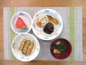 ≪給食≫ ・うな丼 ・すまし汁 ・ひじきの煮物 ・かぼちゃの素揚げ ・れんこんの酢の物 ・フルーツ(すいか)