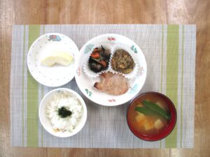 本日は、磯の香りのよい「海苔ご飯」に「豚ヒレ肉の味噌マヨ焼き」です。豚ヒレ肉には、ビタミンB1が豊富で、疲労回復に役立つと言われています。気温差があると、身体も疲れやすくなるので、積極的に取り入れるといいですね。