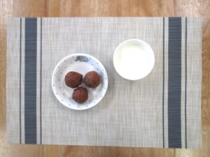 ≪おやつ≫ ・牛乳 ・おからココアドーナツ(アレルギー対応は卵抜きおからココアドーナツ)