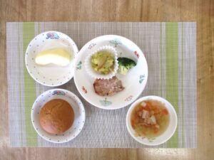 2026年2月19日 by 和光保育園 2月19日(木)給食 2月19日(木)おやつ ≪給食≫ ・変わりパン ・トマトスープ ・豚ヒレ肉の塩麹焼き ・温野菜(ブロッコリー) ・じゃがいものカレー炒め ・フルーツ(りんご) ≪おやつ≫ ・牛乳 ・肉味噌おにぎり 本日の「トマトスープ」は、一から鶏ガラ出汁をとっています。野菜の甘みとベーコンの旨味で塩のみの味付けでもおいしく食べられます。 野菜の苦手なお子さんにも食べやすいスープです。